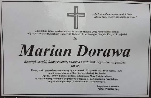 Z wielkim żalem i głębokim smutkiem przyjęliśmy wiadomość o śmierci w dniu 19 stycznia 2022 roku zasłużonego filatelisty Okręgu Toruńskiego PZF Kolegi Mariana Dorawy, wspaniałego Człowieka, doskonałego Filatelisty. Urodzony 31 sierpnia 1936 roku w Chełmży, posiadał wyższe wykształcenie mgr zabytkoznawstwa i konserwatorstwa .